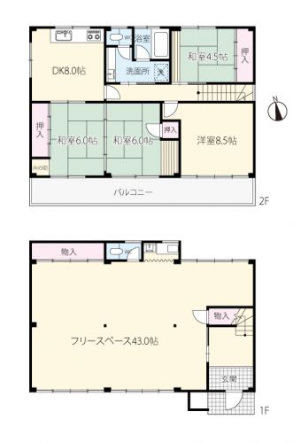| 1階43帖のフリースペースは用途いろいろ!作業場や趣味スペースに最適ですよ♪また鉄骨造なのでお好きな間取に変更できます。リノベーションにも最適ですよ! | |||